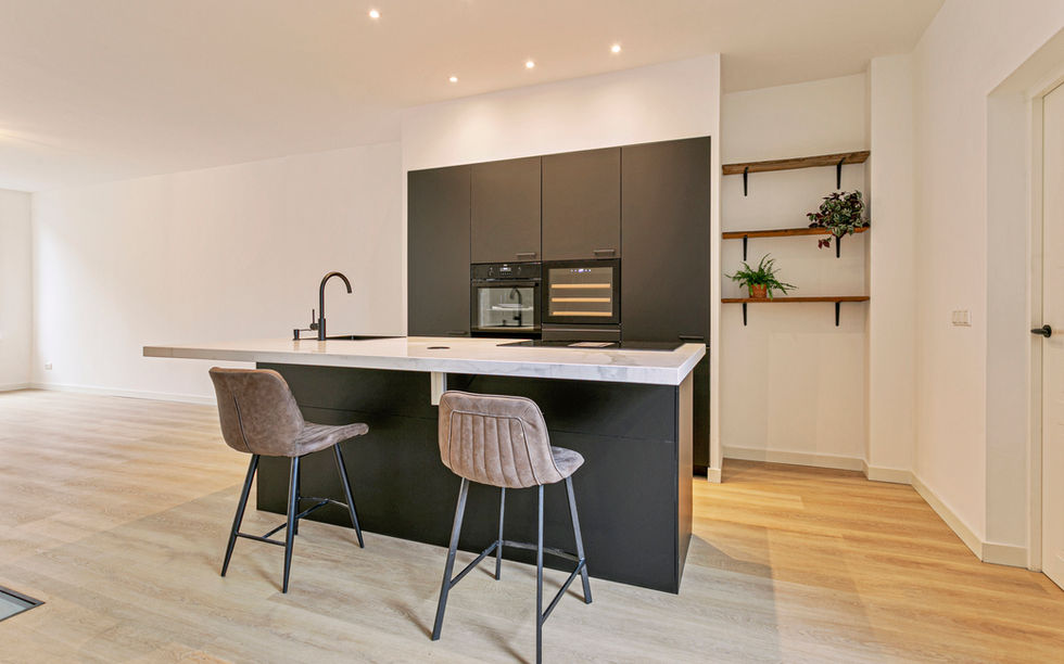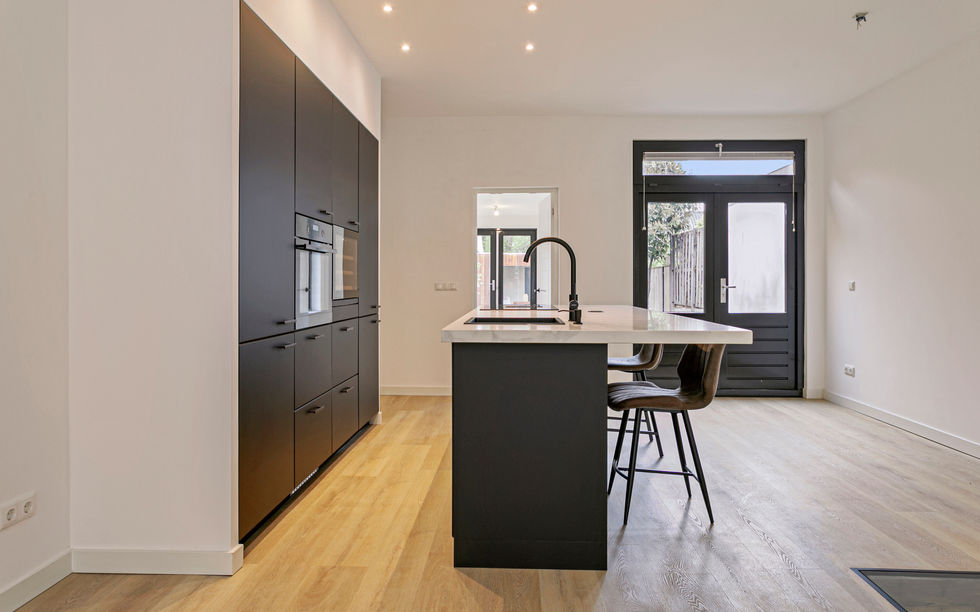In deze eengezinswoning is de indeling grondig aangepakt om de ruimte optimaal te benutten en het wooncomfort te verhogen. Een bijzondere vondst was de kelder, die in het ontwerp is opgenomen als een sfeervolle wijnkelder. Via een glazen plaat in de keuken is deze wijnkelder zichtbaar, wat een luxe en moderne touch toevoegt aan de woning.