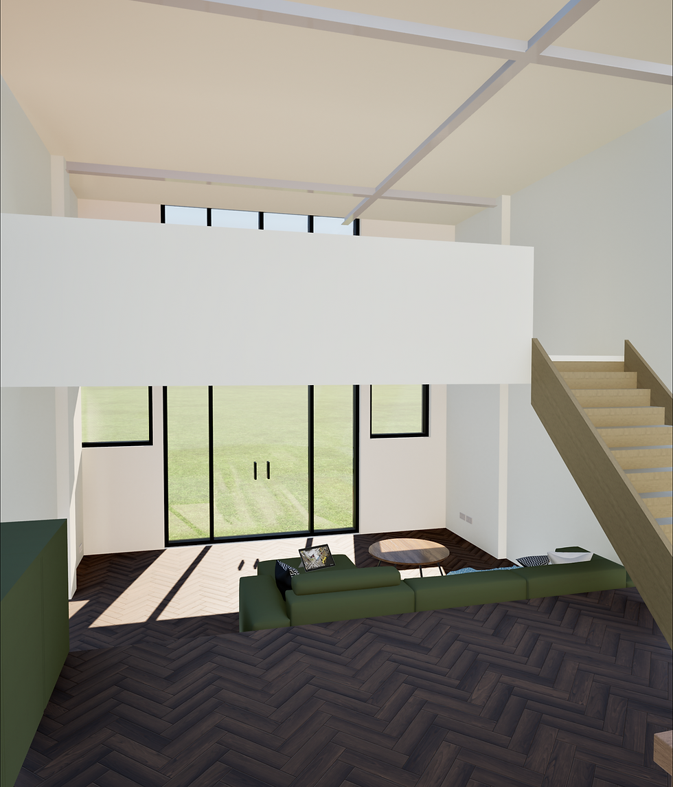 Transformatie Garage naar Woning – Een industriële garage is omgebouwd tot een moderne woning met behoud van karakter. De oude stalen constructie met ophangelementen is behouden, een halve verdieping is toegevoegd en een volledig glazen gevel zorgt voor maximale lichtinval. Hoogteverschillen creëren een speelse en dynamische leefruimte.